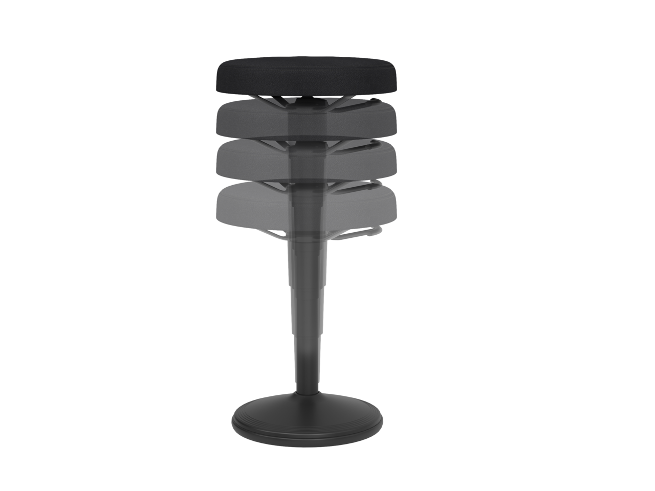 Die stufenlose Höhenverstellung (ca. 55 – 81 cm) erfolgt über eine hochwertige Gasdruckfeder, so passt sich der Hocker an verschiedene Körpergrößen und Tischhöhen an – von klassischem Schreibtisch über erhöhte Arbeitsflächen bis zum Stehbereich.